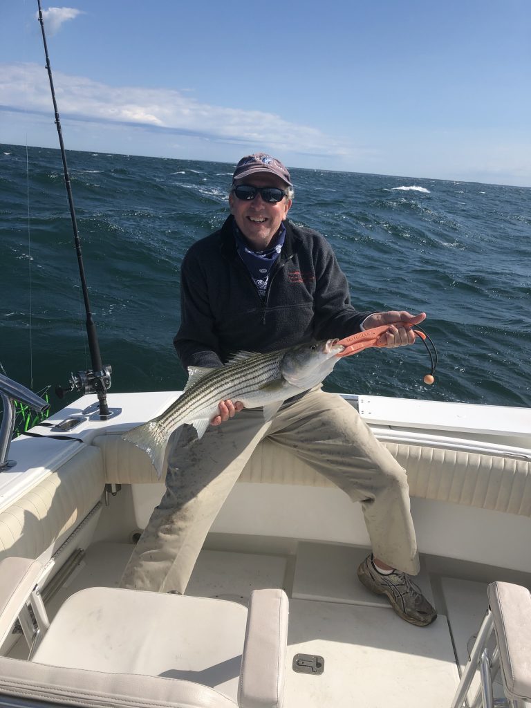 Dave brings his son, Patrick, fishing with Captain Joe every year. It’s a great family tradition. Dave is content to sit in the cockpit and enjoy the day. Patrick stands ready at the reel to wind in the fish. Today, Fathers Day, was a great striped bass fishing day!! The fish showed up just for fathers, off the great back beach of Cape Cod.